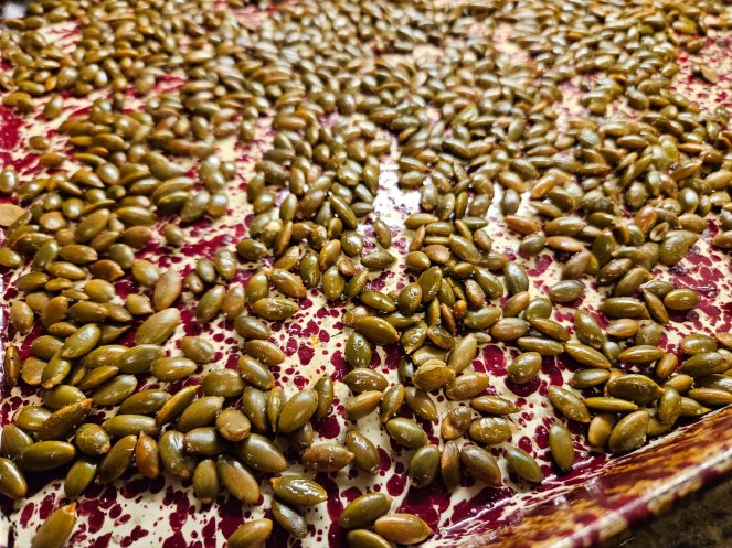 Take the 1 lb of raw pepita seeds and put them in a small bowl. Mix the avocado oil and salt together with the pepita seeds. When thoroughly mixed, lay the seeds out on a baking sheet in a single layer. Put the seeds in a preheated oven of 300 degrees. Bake for 30 minutes, turning them every 10 minutes. Do not over bake. If they start turning brown, you should take them out of the oven. Picture below to show what they should look like for the perfect crunch!