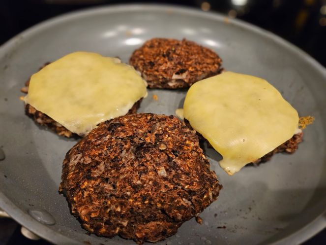 To make Black Bean Hamburger Patties, first you place the chopped onions and drained black beans into a blender. Pulse the ingredients about 5 or 6 times. Do not over mix, or it will not turn out right. It should have a lot of full beans and onions in the mixture. Transfer the mixture to a mixing bowl and add the egg and 1/2 cup quick oats. Mix all of it together with a large fork and mix it well. Then add all the seasonings and mix well with a fork. Chill in the refrigerator for about 10 minutes. Remove from the refrigerator and shape 4 patties. Use a little organic avocado oil or spray to the frying pan. Cook 10 minutes on one side on medium heat, then flip and cook the other side for 10 minutes. Continue adding or spraying a little avocado oil while frying so they don’t get dry. You want them to be darker and crispy, but try not to burn them.